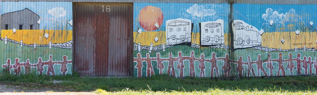 Barquitos de papel es una obra propia de la artista, por la cual se inspiró para realizar este mural, pintando un tren y vagones con la ayuda de diferentes niños que concurrieron al encuentro. Utilizo el estilo de chorreado.